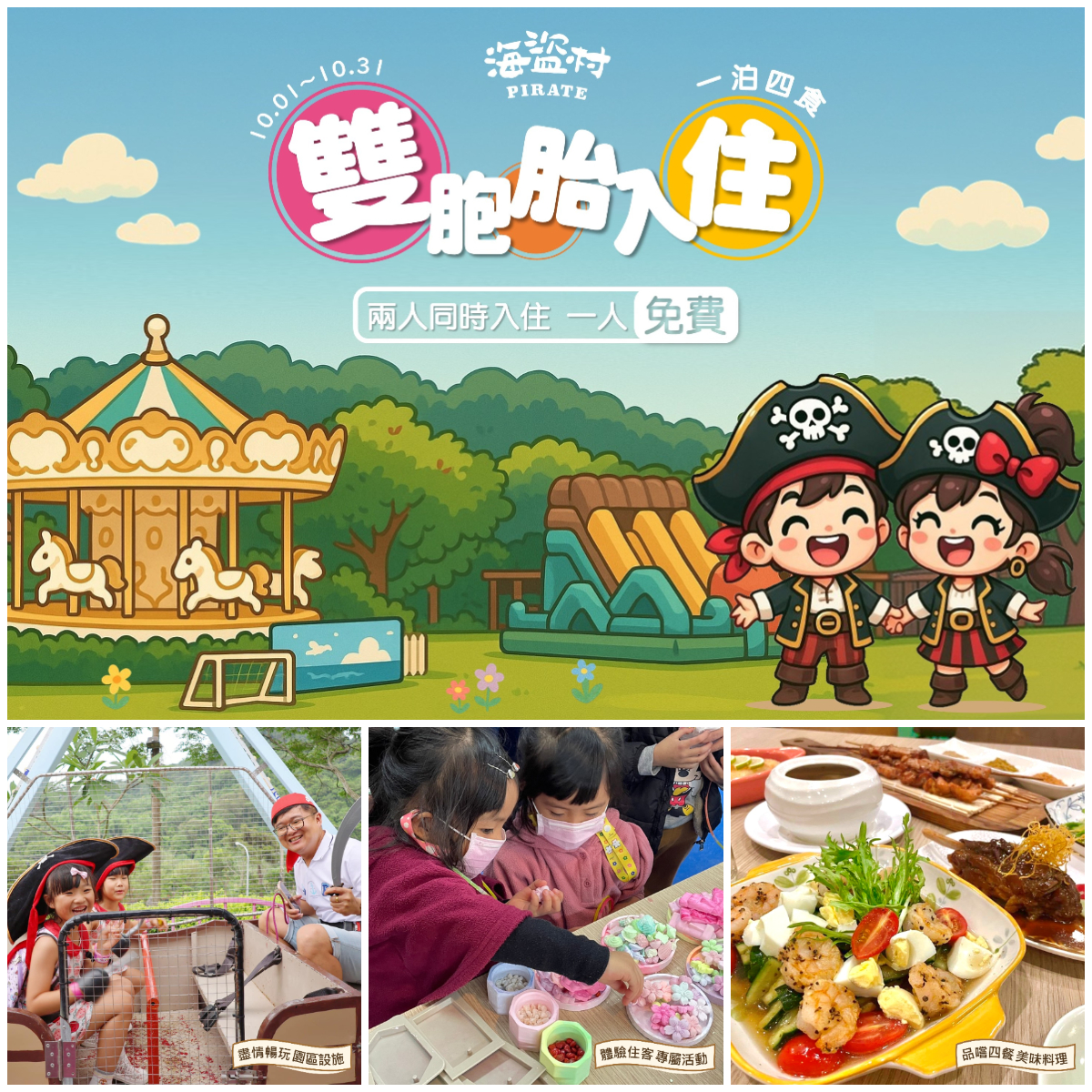 十月份來海盜村渡假就是要加倍幸福!2025年10月1日至10月31日間,雙胞胎同時入住「一泊四食」,即享其中一人「免費入住」優惠!同樣的美味饗宴、同樣的暢快體驗,雙倍快樂、半價享受~快帶著你的另一個「自己」來場放鬆度假吧!