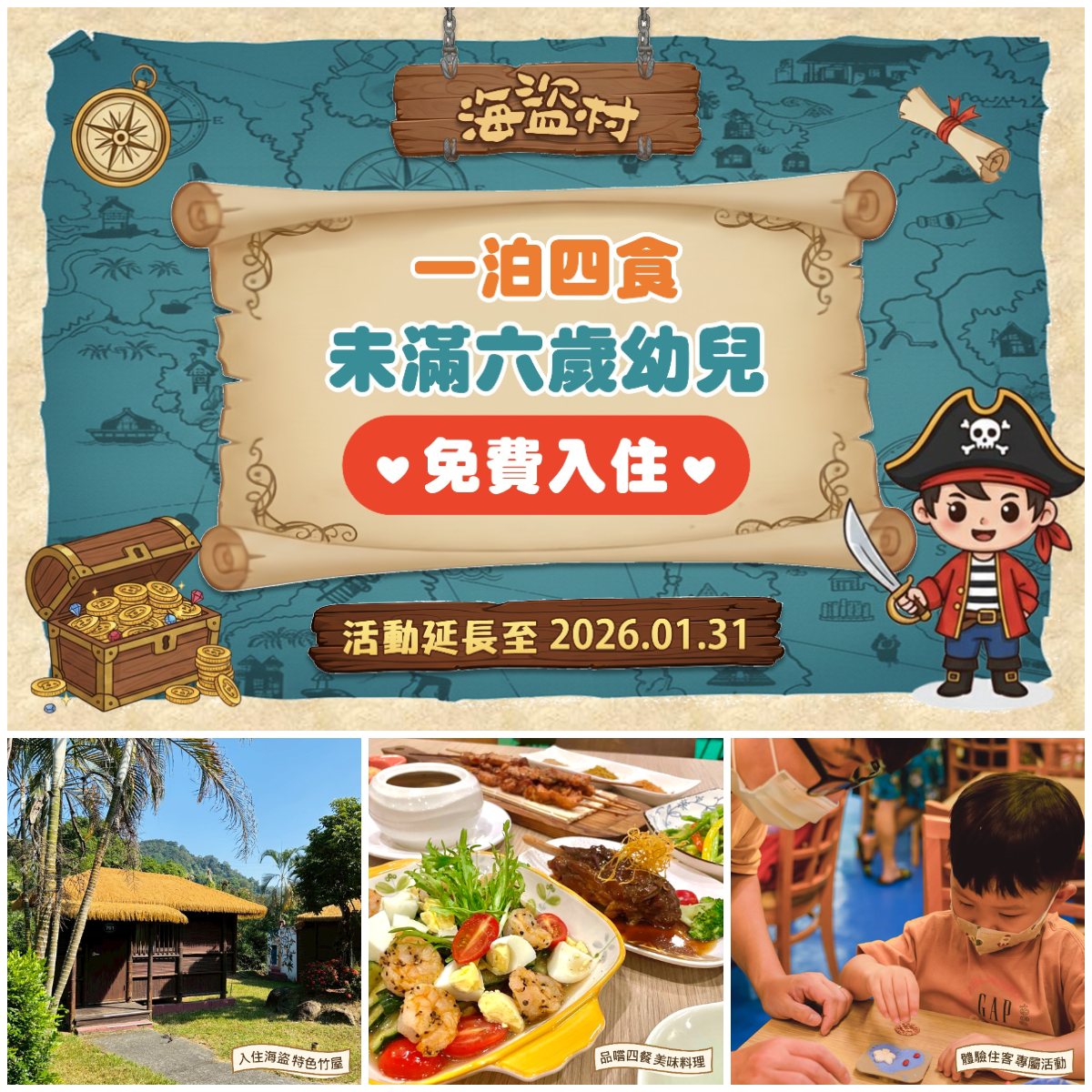 爸媽注意!一泊四食未滿六歲幼兒免費活動延長至2026/1/31止 (不分平假日)!入住暢玩園區多樣設施、享用「四餐」美味料理、體驗「住客專屬活動」,輕鬆度假,留下美好回憶~![]()