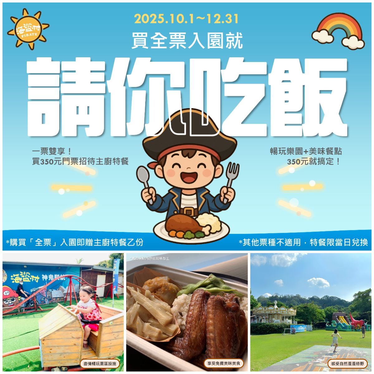 即日起,凡購買「全票」入園海盜村,即贈【海盜特餐乙份】!買350元門票招待主廚特餐,一票雙享~讓你暢玩樂園之餘也能補充滿滿能量,玩得開心又吃得滿足!