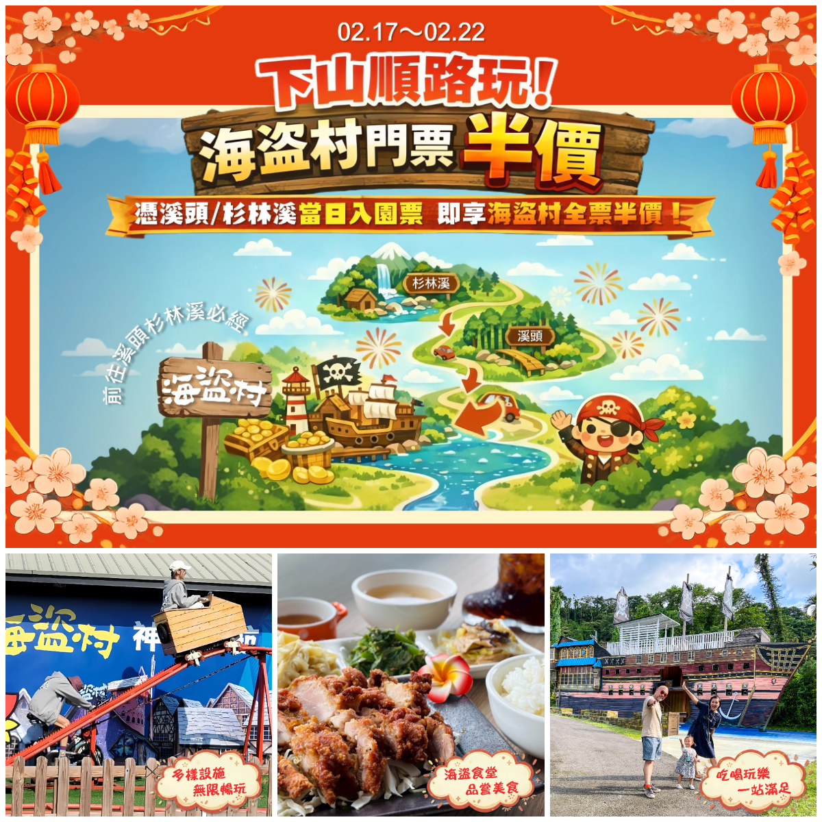 2026/02/17至2026/02/22,凡出示「杉林溪及溪頭」當日入園門票,即享海盜村全票「半價優惠」!不用急著塞車,新年出遊慢慢玩,下山順路中繼休息充電剛剛好~入園豐富設施通通「無限暢玩」,還有海盜食堂供應「美味餐食」。孩子盡情放電,大人也能輕鬆過好年![]()