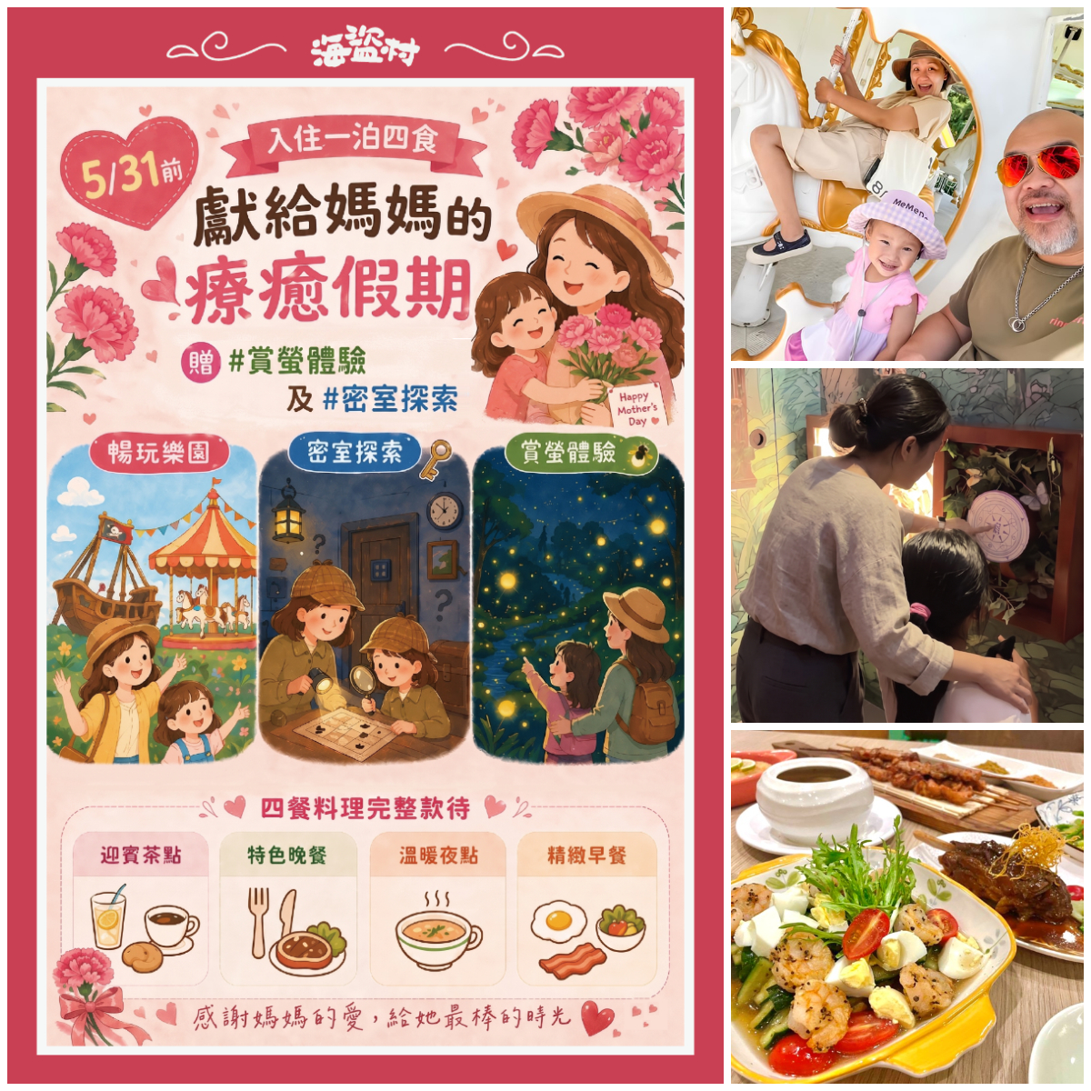5/31前,入住一泊四食,即贈「賞螢體驗」及 全新「密室探索」!四餐料理完整款待,獻給媽媽療癒假期~白天暢玩樂園×漫步綠野×探索密室 ;夜晚走進森林,看螢火點點閃爍!帶媽媽來場不一樣的母親節旅行吧![]()